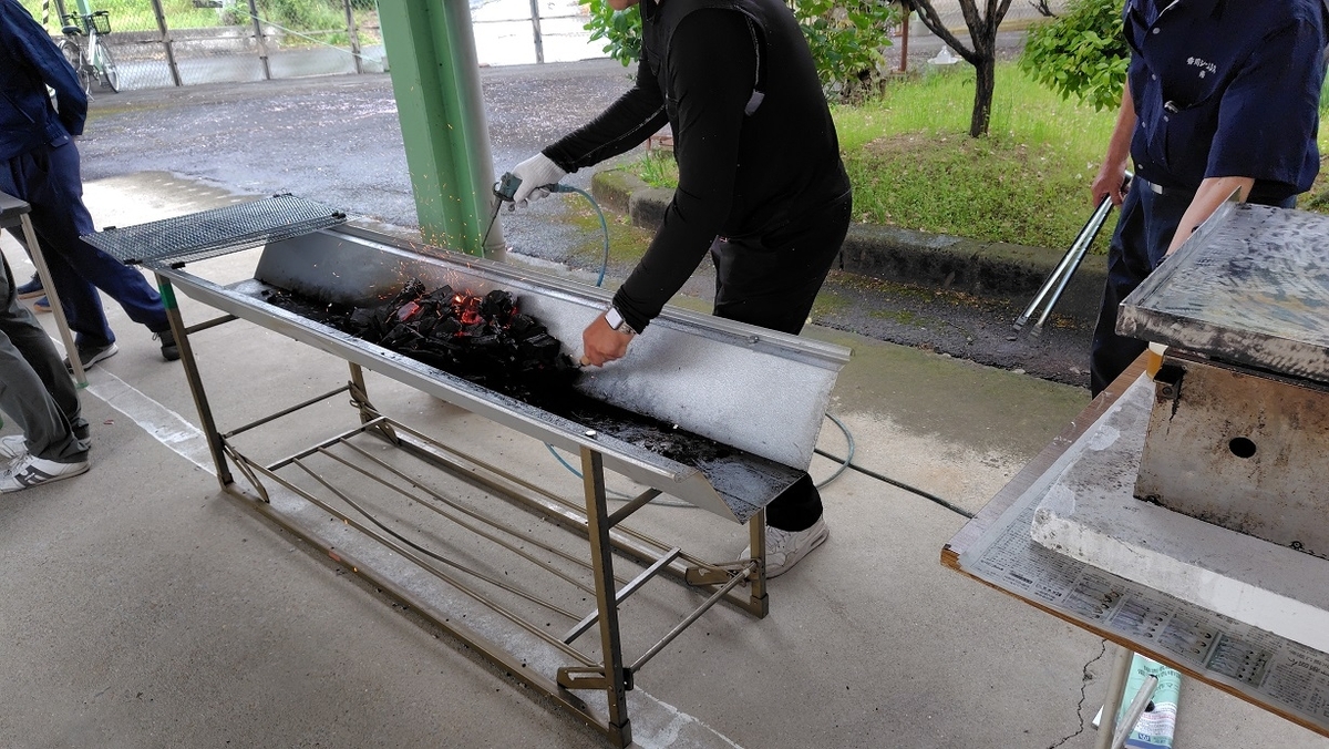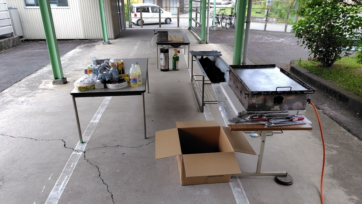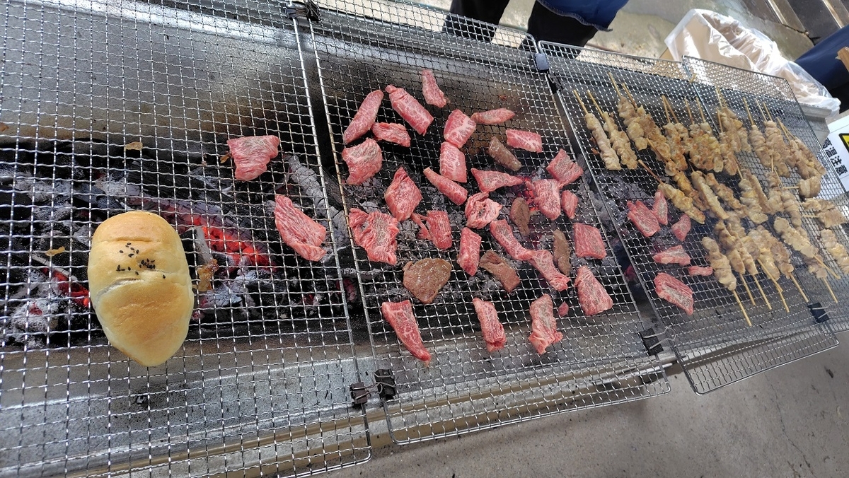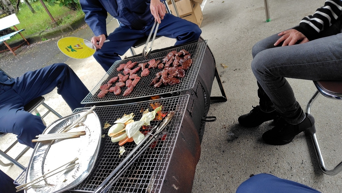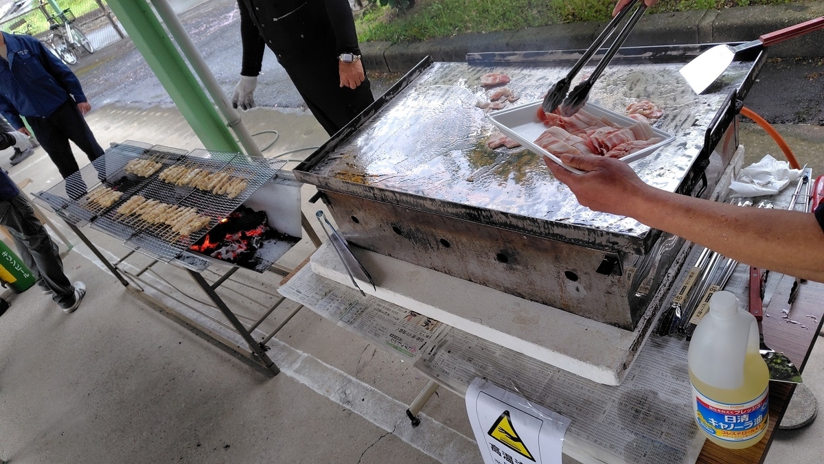 雨だったので屋根のある所で焼いて食堂で食べるスタイルになりました。
