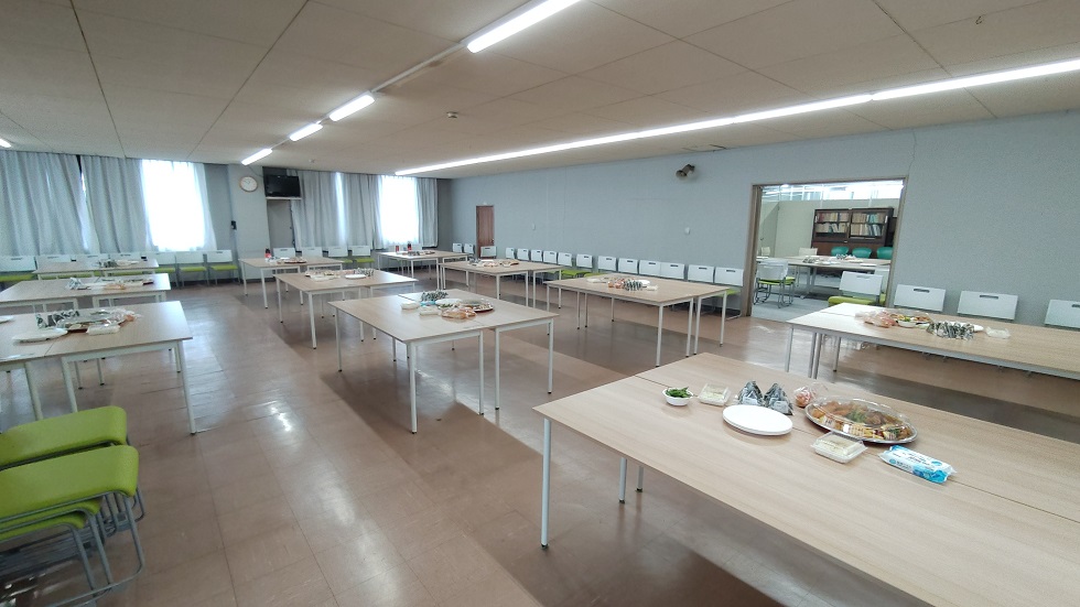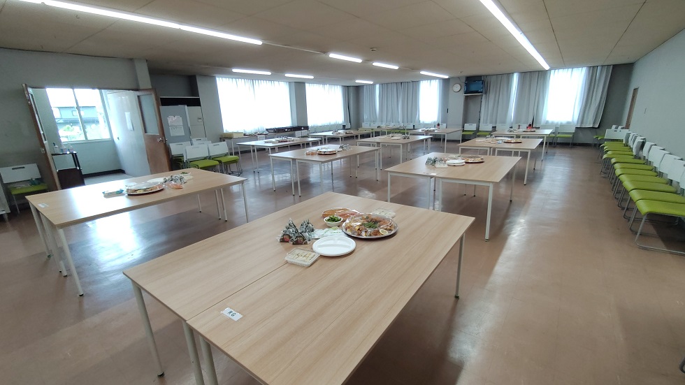 食堂と隣の部屋で食べる場所を作成。各テーブルにはオードブルも。