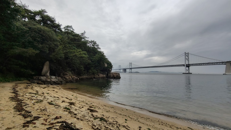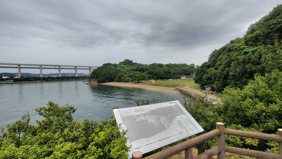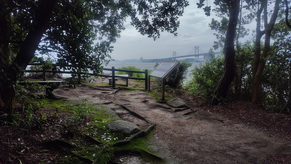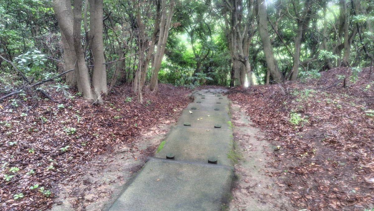 この海岸から遊歩道へ入っていきます。遊歩道には古墳の様なものや展望台があります。入口が草が多くて暑い時期は入る気が失せますが、はじめだけ草があるだけでその後はしっかりと整備された遊歩道です。