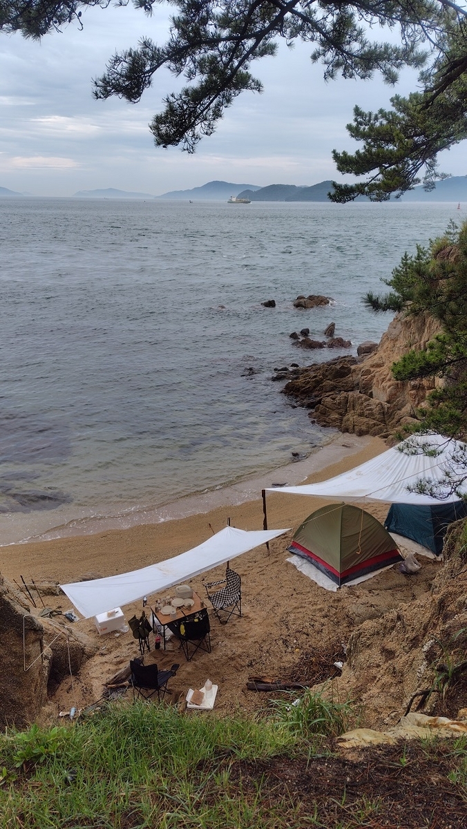 遊歩道を入ってしばらくすると秘密の海岸があって、こちらでもキャンプしている方がいました。軽量テント使用していますが、椅子、テーブルなど結構持ち込んでいると思うので、運ぶのが大変だと思います。何かあっても自己責任の場所ですね。とにかく後片付けだけしっかりして欲しいです。