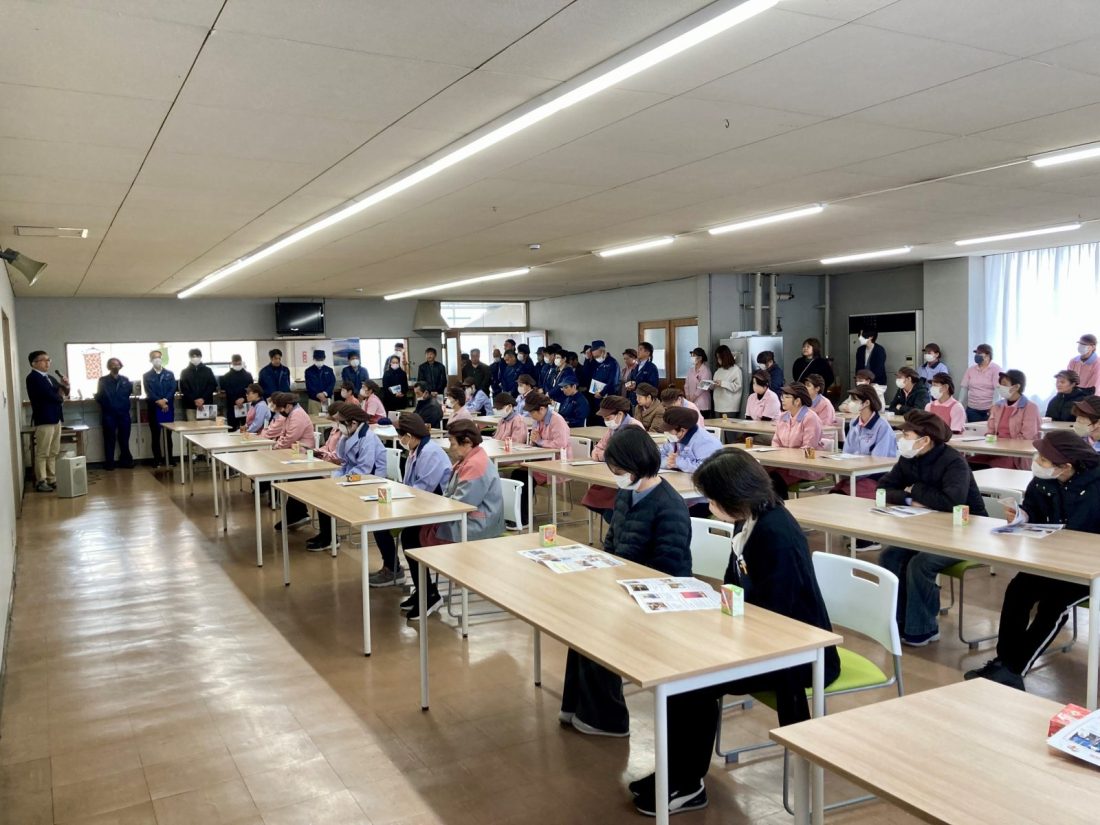食堂にほぼ全社員が集まっています。写真右側にもまだ立っている人がいます。