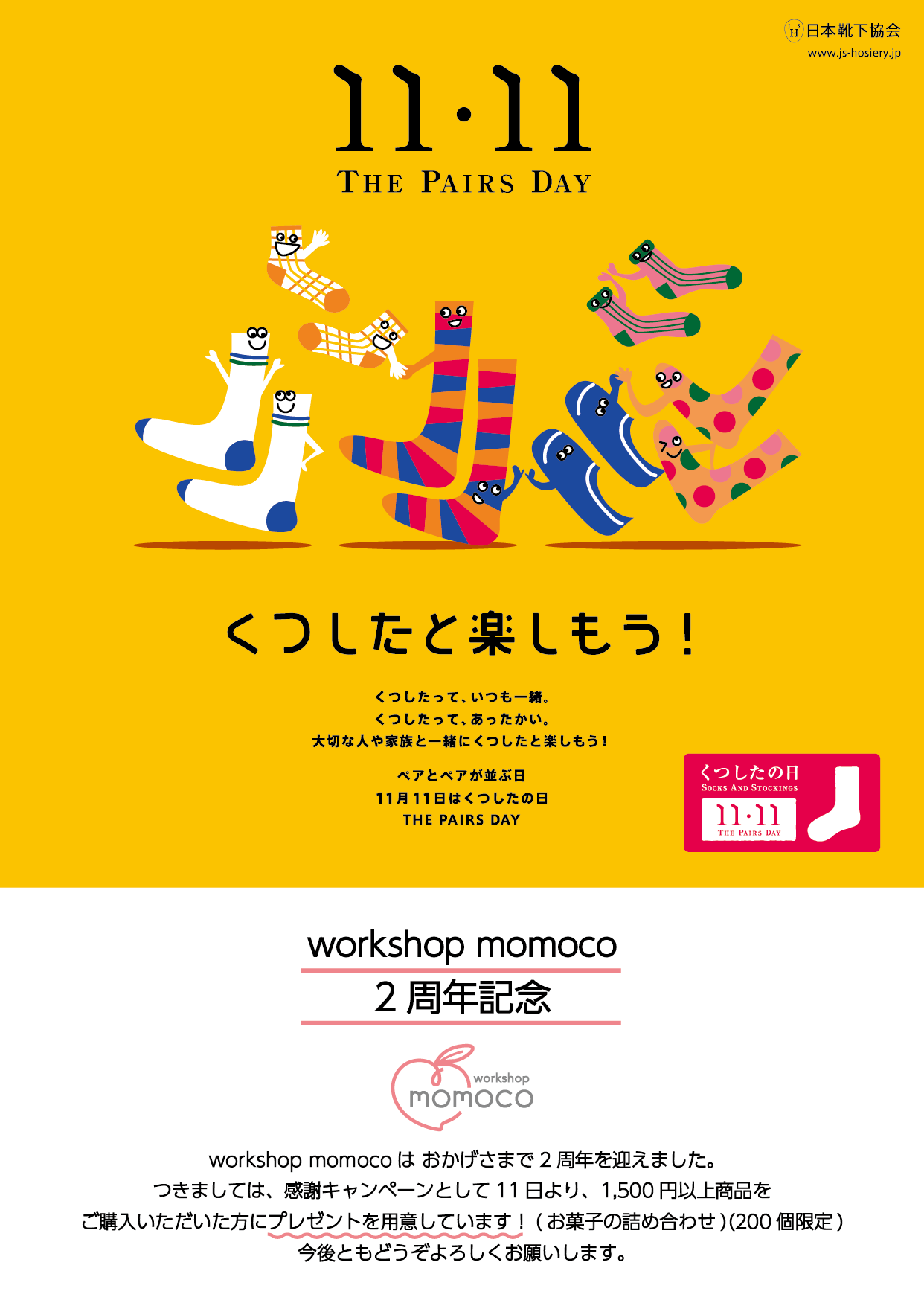 workshop momocoプレゼントキャンペーンのお知らせ 2020.11.10 workshop momocoは おかげさまで2周年を迎えました。つきましては、感謝キャンペーンとして11日より、 1,500円以上商品をご購入いただいた方にプレゼントを 用意しています!(お菓子の詰め合わせ)(200個限定)今後ともどうぞよろしくお願いします。