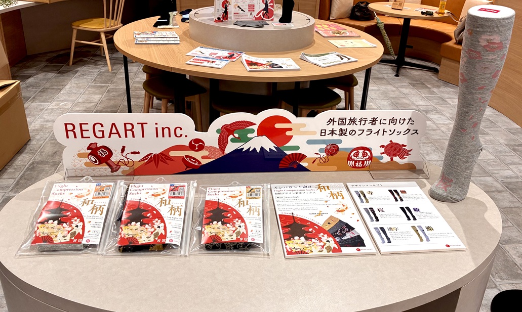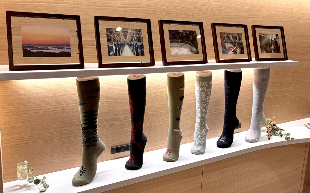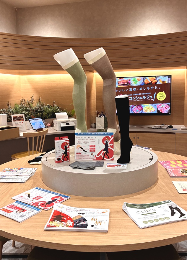 最近発売したマタニティ着圧ソックスも展示しております。すべて香川シームレス㈱で製造したお勧めの商品になります。和柄の着圧ソックスは外国人向けになります。
