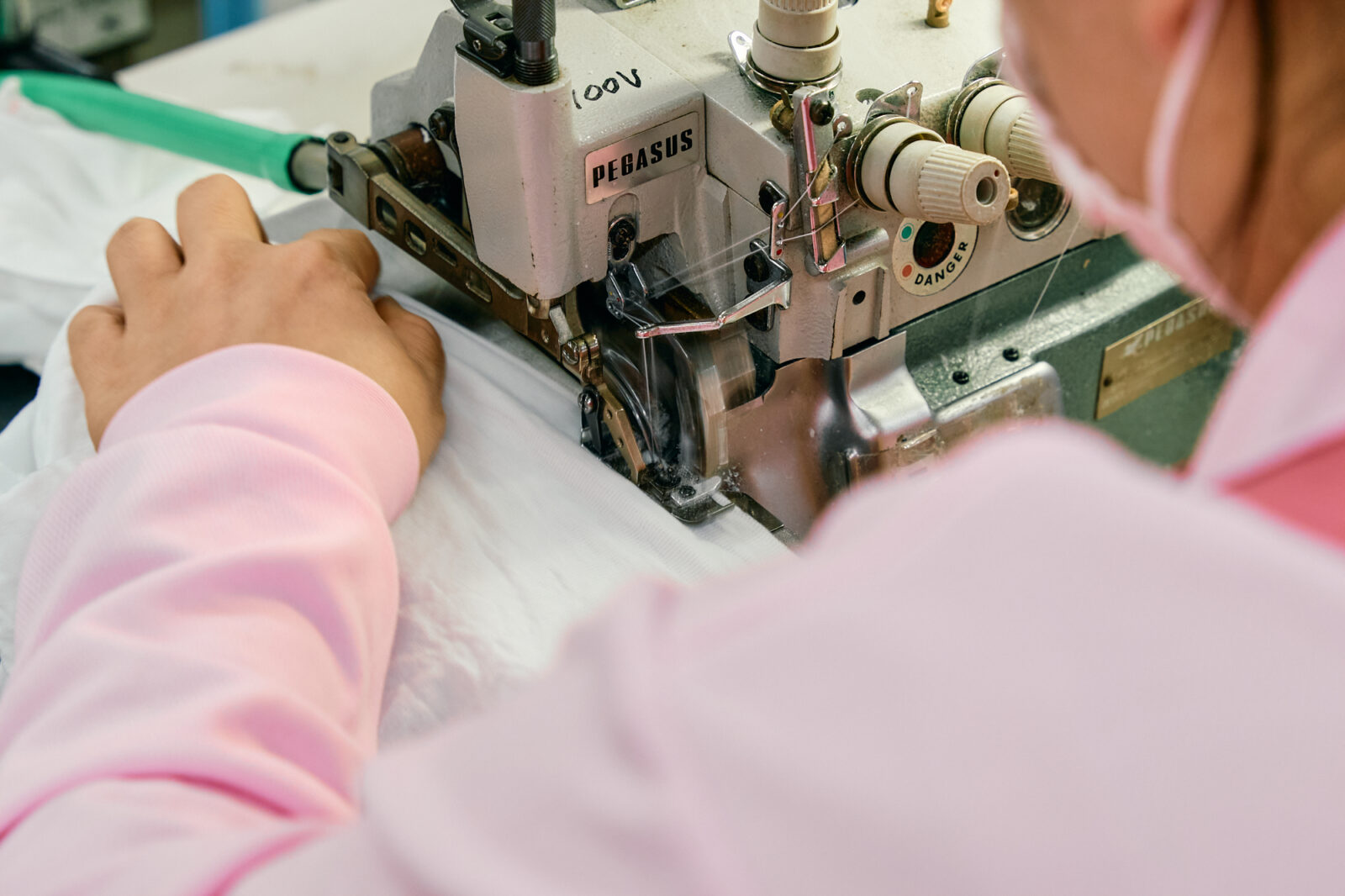• 編成→縫製→染色→セット→装飾→検品→検針→梱包まで社内で完結