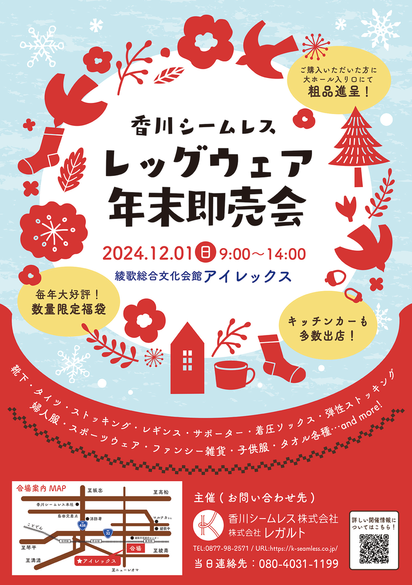 例年同様、弊社香川シームレス㈱で生産したストッキングやタイツはもちろん、ソックスやサポーター、弾性ストッキング、着圧ソックス、婦人服やインナーなどを販売します。